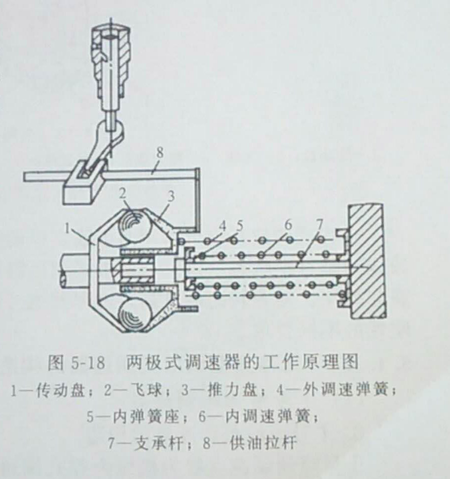 這時,由于內(nèi)彈簧預(yù)緊力大而剛性強,因此即使轉(zhuǎn)速繼續(xù)升高,飛球的離心力仍不足以推動內(nèi)彈簧座移動。但此時如由于外界負荷變化使轉(zhuǎn)速低于n時,外調(diào)速彈簧即可推動供油拉桿左移增加供油量,以保持發(fā)電機組可在nd轉(zhuǎn)速下穩(wěn)定工作。nd即為低空轉(zhuǎn)轉(zhuǎn)速。當(dāng)發(fā)電機組轉(zhuǎn)速升至標(biāo)定轉(zhuǎn)速時,飛球離心力顯著升高,其軸向分力與內(nèi)、外彈簧彈力相平衡。如果這時轉(zhuǎn)速稍許上升,推力盤即推壓內(nèi)、外彈簧,使供油量減少,其工作情況與前述單程式調(diào)速器相同。